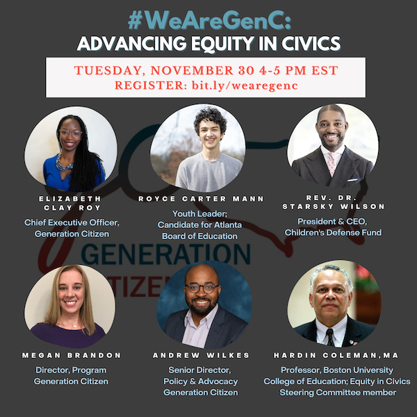 This week, Generation Citizen kicked off our #EquityInCivics event series with our first national conversation, “#WeAreGenC: Advancing Equity in Civics”, co-hosted with our colleagues at the Children’s Defense Fund. We were thrilled to welcome Rev. Dr. Starsky Wilson of the Children’s Defense Fund, Atlanta-based youth activist Royce Carter Mann, and Boston University professor Dr. Hardin… Continue reading Event Series Launch: Equity in Civics