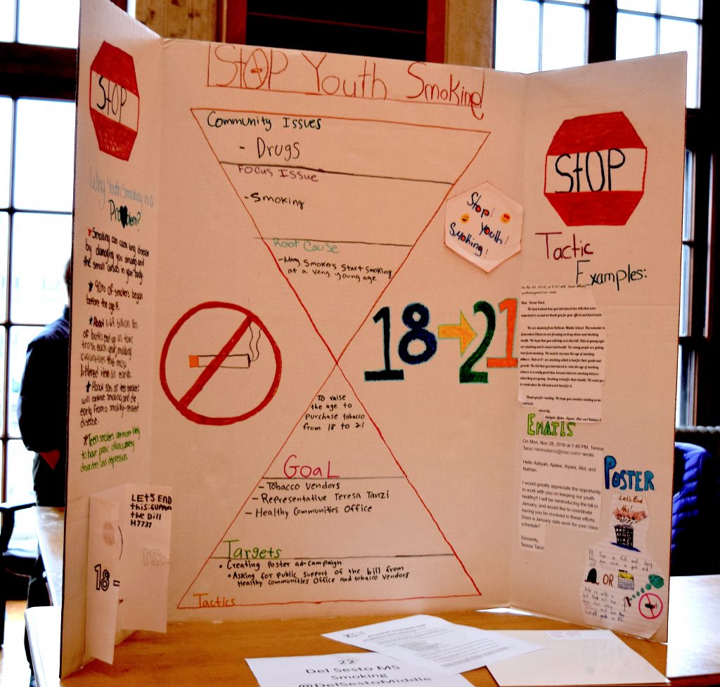 This fall, students in Cindy Lucock’s GC class at Del Sesto Middle School decided to take action on the issue of drug use in their community, ultimately focusing specifically on smoking. In researching the topic, the class learned that most smokers begin using tobacco at a young age. Students shared stories of seeing their younger siblings roll up paper and pretend to be smoking cigarettes, or of family members who developed health problems or died from tobacco use. When they learned about a bill that would raise the legal age for purchasing tobacco to 21, they decided to focus their advocacy project on lobbying for the bill to be reintroduced and passed in the 2017 legislative session.