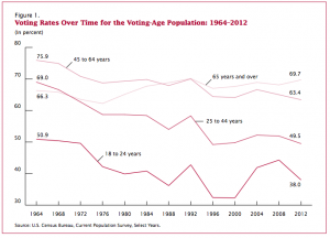 2.) This curve has persisted in election after election for decades, proving that age is indeed the real factor, not generation. As shown in the census bureau’s graph below, while overall turnout has generally declined over the past several decades, the dramatic difference in turnout between younger and older voters has always been clear: